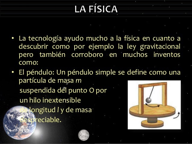 - 4. • La tecnología ayudo mucho a la física en cuanto adescubrir como por ejemplo la ley gravitacionalpero también corroboro en muchos inventoscomo:• El péndulo: Un péndulo simple se define como unapartícula de masa msuspendida del punto O porun hilo inextensiblede longitud l y de masadespreciable.