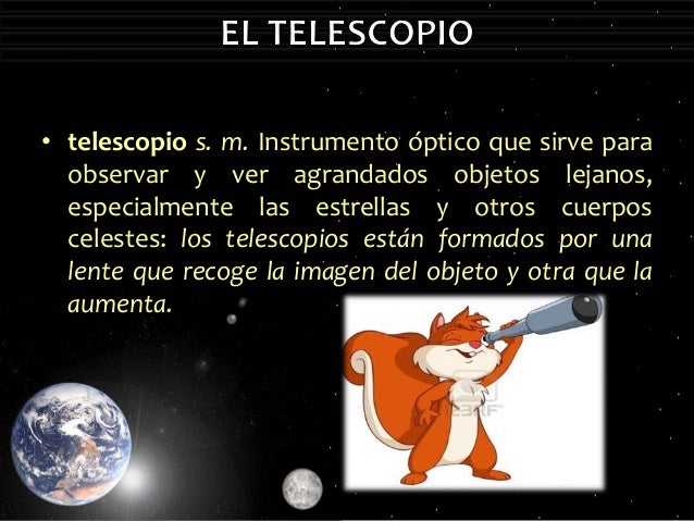 - 5. • telescopio Instrumento óptico que sirve paraobservar y ver agrandados objetos lejanos,especialmente las estrellas y otros cuerposcelestes: los telescopios están formados por unalente que recoge la imagen del objeto y otra que laaumenta.