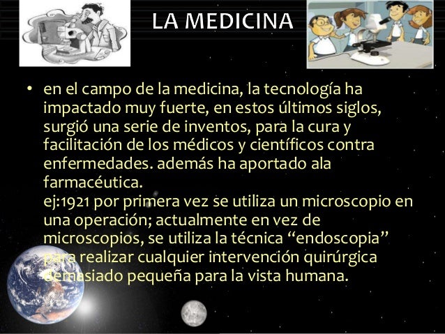- 6. • en el campo de la medicina, la tecnología haimpactado muy fuerte, en estos últimos siglos,surgió una serie de inventos, para la cura yfacilitación de los médicos y científicos contraenfermedades. además ha aportado alafarmacéutica.ej:1921 por primera vez se utiliza un microscopio enuna operación; actualmente en vez demicroscopios, se utiliza la técnica “endoscopia”para realizar cualquier intervención quirúrgicademasiado pequeña para la vista humana.