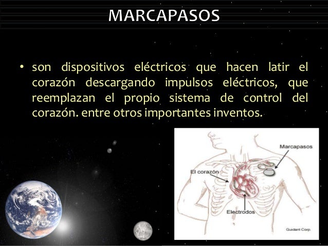 - 7. • son dispositivos eléctricos que hacen latir elcorazón descargando impulsos eléctricos, quereemplazan el propio sistema de control delcorazón. entre otros importantes inventos.